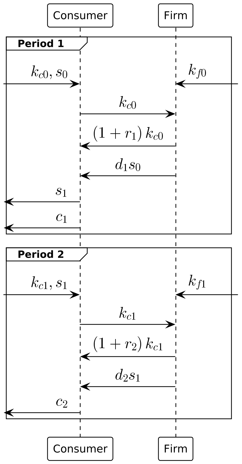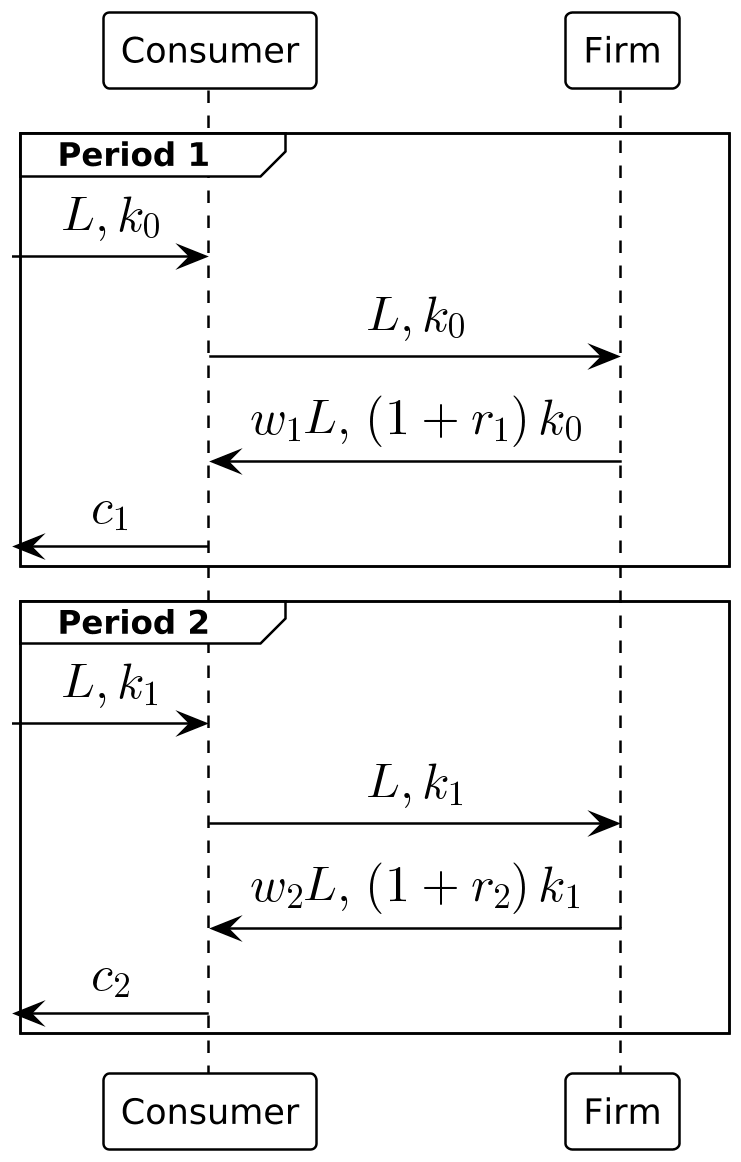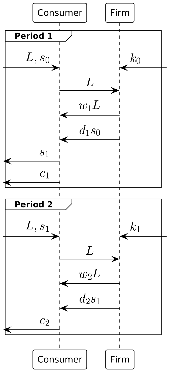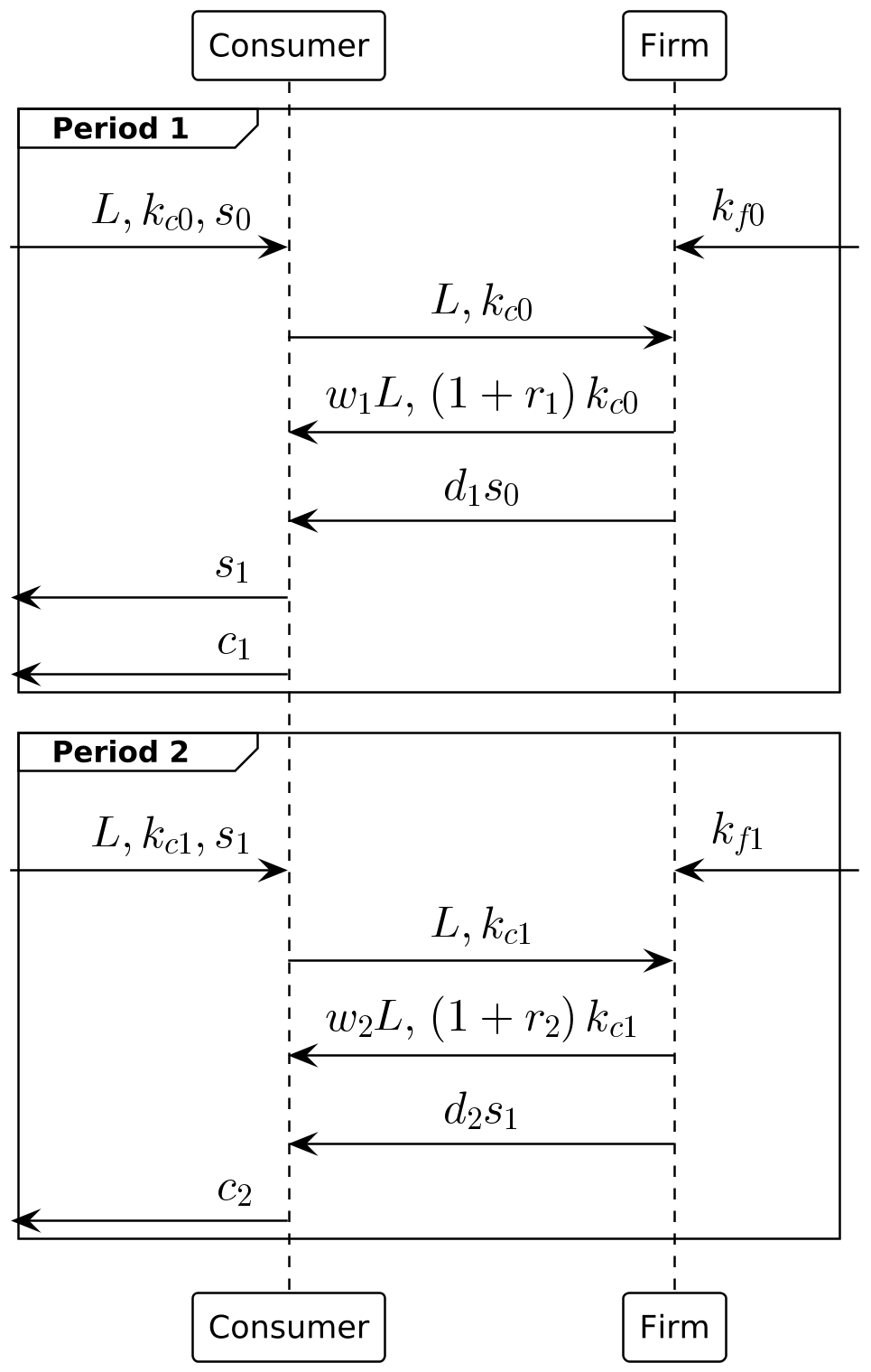 相比之前的模型设定,本此模型中,我们假设模型对应一个私有制社会—-企业为居民所拥有,其股份由居民所持有 具体会有以下的一些不同,可以通过时序图1和时序图2看出: